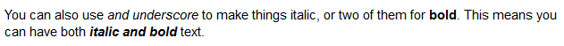 You can also use an _underscore to make things italic_, or two of them for __bold__. This means you can have both _**italic and bold**_ text.