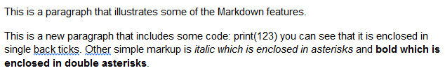 This is a new paragraph that includes some code: `print(123)` you can see that it is enclosed in single back ticks. Other simple markup is *italic which is enclosed in asterisks* and **bold which is enclosed in double asterisks**.