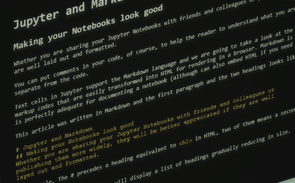Text cells in Jupyter support the Markdown language and we are going to take a look at the facilities that it offers. Markdown is a set of simple markup codes that are easily transformed into HTML for rendering in a browser. Markdown is nowhere near as sophisticated, or complex, as HTML but is perfectly adequate for documenting a notebook (although can also embed HTML if you need more control over the look or layout).